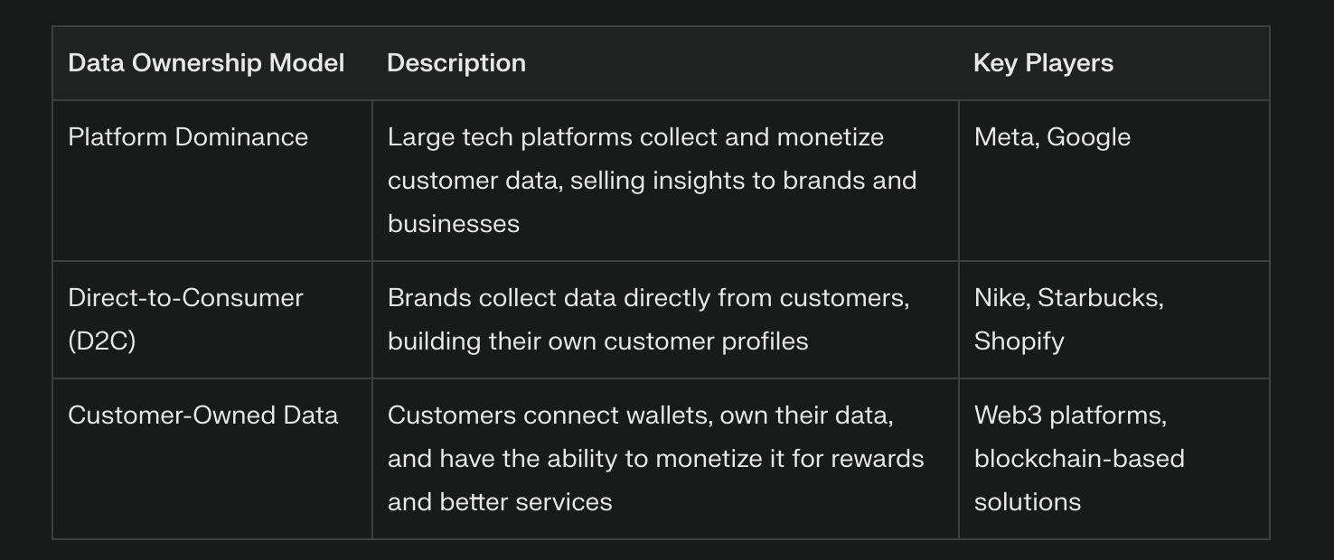 Over time, this led to the rise of the Direct-to-Consumer (D2C) movement, where brands began collecting data directly from their customers to build personalized profiles. Companies like Nike, Starbucks, and Shopify led this approach, aiming to create more tailored consumer experiences. However, even this strategy had its limitations. The data collected was often fragmented and impersonal—a blurry picture made up of cold numbers like average order value, browsing history, and click-through rates. Users felt like passive participants in the data exchange, with little real control or understanding of how their information was used.