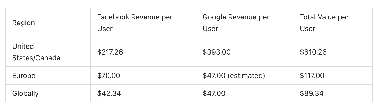 Sounds like a dream, right? Well, here's a wake-up call: According to ProtonMail's 2024 review, last year your data alone put over $610 into Google and Facebook's pockets if you live in the United States and Canada—Facebook earned an average of $217 per user, and Google made approximately $393 per user through advertising. In Europe, Facebook's annual revenue per user is about $70, and globally, it's $42. Google's global average revenue per user is about $47. That means globally, your data is worth around $89 per year to Google and Facebook combined. Meanwhile, brands you love are burning through their budgets just trying to catch your attention, often driving up the prices you pay.